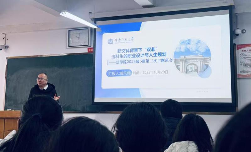 10月29日下午,聚焦“新文科背景下‘双非’法科生的职业设计与人生规划”主题班会在启智楼207教室召开。法学院社会工作秘书、2024级5班班主任曾凡伟博士担任主讲。曾凡伟以“职业设计与人生规划”为主题,结合新文科建设背景与法学专业特点,从理想信念、爱国情怀、能力提升三个方面展开讲解。他强调,一要强化理想信念根基,深刻理解“两个确立”的决定性意义,增强“四个意识”、坚定“四个自信”、做到“两个维护”,牢固树立为中国特色社会主义法治事业奋斗终身的远大志向;二要厚植爱国主义情怀,传承红色基因,弘扬爱国主义精神,以实际行动践行“请党放心,强国有我”的青春誓言;三要提升综合能力素养,聚焦法学主业,不断提升专业能力、创新精神和实践本领,为未来职业发展夯实基础。
