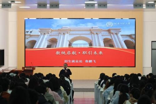 鲁鹏飞围绕近年就业数据分析、影响就业观念的因素、多元就业方向分析和信息获取指南等四方面展开细致讲解。他指出,成功就业的关键在于将个人优势与市场信息有效对接。结合招生就业处的实际案例,他强调毕业生要立足专业特色,既要关注传统就业领域的稳定优势,也要把握新兴行业的发展机遇。建议同学们充分利用校园招聘会、学校就业平台、官方就业网站和人脉网络等核心渠道,主动获取就业信息,提升求职竞争力。