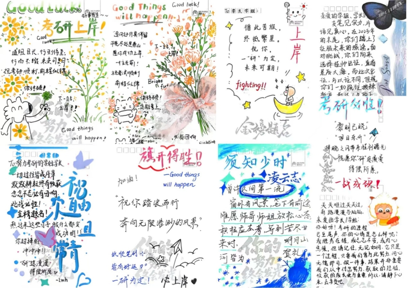 活动分为祝福征集与现场送达两个环节。12月12日至17日,学院面向全体师生征集祝福,发放统一明信片供同学们填写。活动吸引众多学生积极参与,大家结合历史学科特色,在明信片上写下诚挚的鼓励和祝福。12月18日,学生代表携带数百张承载着祝福的明信片走进文渊楼考研教室,轻声有序地将明信片张贴在课桌角落、笔记本旁以及走廊公告板上。这些寄语充分体现了专业特色,有的将考研比作治史研究,勉励学子“考辨如治史,细处见真章”;有的引用历史典故,寄托“长风破浪,直济沧海”的祝愿。收到明信片后,不少学子将其夹入复习资料中,或设为手机锁屏,以此激励自己。更有学长主动留下便条,表示愿将这份温暖继续传递。
