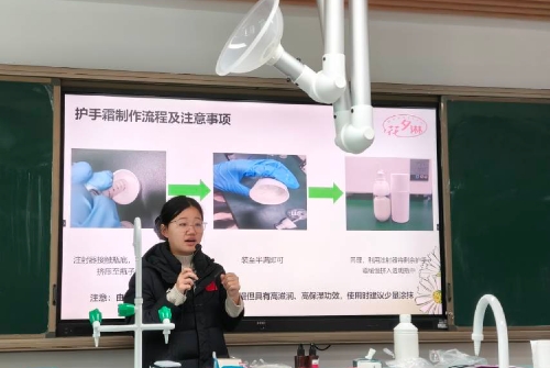活动当天,社团成员化身“科学导师”,通过PPT讲解、动画短片播放结合趣味问答的互动形式,将手工皂与护手霜制作背后的乳化反应等基础化学原理具象化呈现,针对孩子们提出的“化学是否都有危险性”的疑问进行解答,破除“化学=危险”的认知误区。制作护手霜环节,大家严格按照配比量取油相、水相原料,手动搅拌完成乳化过程;依次添加香精、保湿剂等辅料调整质地与香味,最后完成装瓶密封。制作手工皂环节,孩子们称量皂基后加入色素、精油,调配出不同的色彩与气味,制好的皂液用模具初步塑形,再以脱模修整收尾,专属的日化成品便呈现在每个人手中。现场气氛热烈,科普实践的魅力与乐趣扑面而来。
