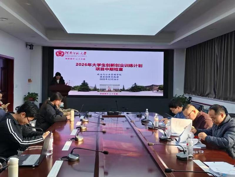 为精准掌握大学生创新创业训练项目进展动态,切实提升项目研究质量与实践成效,12月26日下午,政治与公共管理学院“又日新”辅导员工作室在学院楼517室顺利举办2026年大学生创新创业训练计划项目中期检查答辩会。学院杨宇勃、王晓宾、徐晓攀、毛哲山四位教师担任评委,各项目负责人携核心成员悉数到场参与答辩。