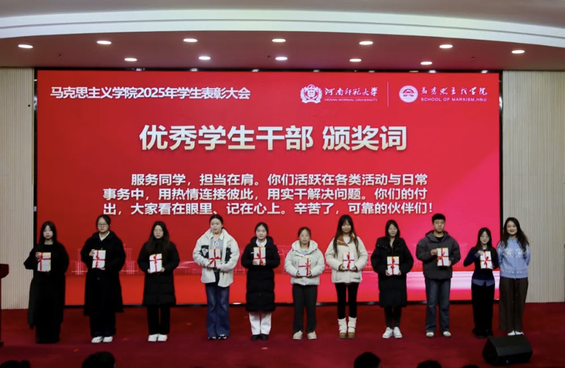大会在庄严的国歌声中拉开序幕。马克思主义学院副院长姚广利宣读2025年学生表彰决定,对本年度在集体建设、学业科研、实践服务等方面表现突出的先进集体和优秀个人致以热烈祝贺。随后,领导老师为优秀学生干部、志愿之星、学习之星等优秀学生代表颁发荣誉证书并合影留念。胡锦鹏、何静雯、杨一帆、邓林蕊、王青鹤依次作为学生代表发言,他们结合自身在集体建设、责任担当、专业学习、理论实践等方面的经历,分享成长感悟与奋进心得,展现马院学子的理想追求与青春风貌,引发全场师生的强烈共鸣。