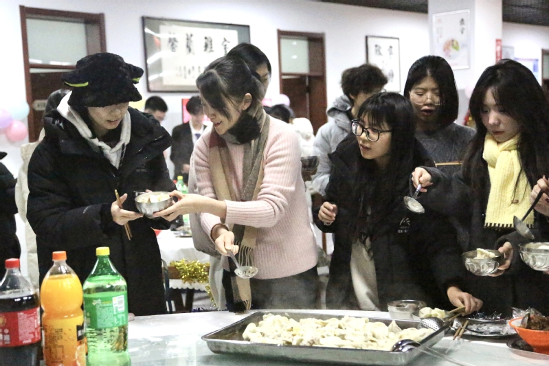 活动开场,轻松的音乐互动迅速调动现场氛围,同学们踊跃参与答题互动,精美礼物接连送出,现场笑语盈盈、暖意融融;随后,师生围坐桌前协作备餐,揉面、擀皮、包馅环节有条不紊,大家分工配合、默契十足,充分发挥创意打造“特色福饺”,学院老师现场点评趣味作品,为最佳创意小组送上纪念小礼,手作的温度让团圆氛围愈发浓厚,师生情谊在面团的揉搓与馅料的包合中不断升温;趣味互动环节精彩纷呈,即兴才艺展演、益智灯谜竞猜、趣味击鼓传花等活动轮番上演。师生同台参与、默契协作,歌声与掌声交织,欢笑与喝彩齐鸣,丰厚奖品依次派送,惊喜不断升温。活动尾声,热气腾腾的团圆水饺端上餐桌,师生围坐共品鲜香,同步收看央视跨年晚会,在温馨祥和的氛围中辞旧迎新,定格下师生同心的温暖瞬间。