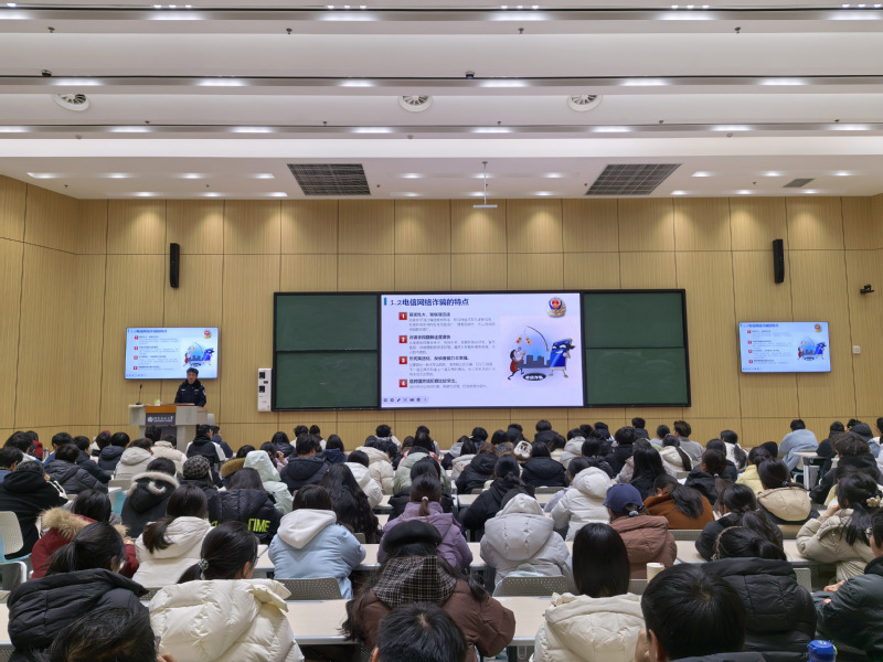 靖士超警官从电信诈骗的法律界定与构成要件入手,系统梳理了诈骗常见类型及其演变趋势,深入剖析了作案手段与内在逻辑。结合高校学生特点,他详细解读了“8个凡是”“反诈灵魂8问”“三不一多”等实用防诈技巧,将专业知识转化为易懂易记的操作指南。杨哲宇警官聚焦学生群体高发的九类骗局,通过真实案例揭露诈骗的话术套路与手法,提醒大家要时刻保持警惕、理性判断。他还特别强调了涉“两卡”(电话卡、银行卡)违法犯罪的法律风险,引导学生自觉远离相关行为,保护个人信息与信用安全。辅导员张德凯在总结中指出,防范电信诈骗是校园安全工作的重要环节,希望同学们真正将所学知识转化为自我保护能力,提升法律意识与风险辨识力,互相提醒、共同防范,携手筑牢校园反诈安全网。