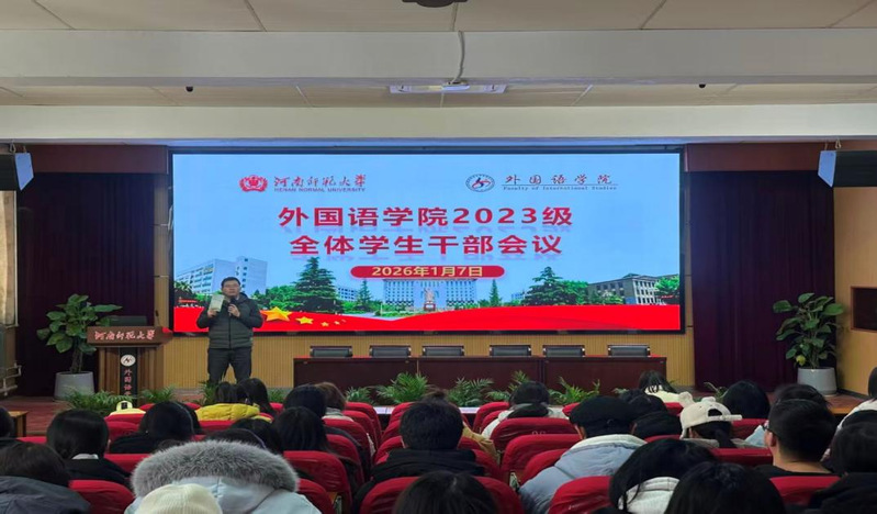 为切实维护年级安全稳定,关爱学生心理健康,增强学生干部的责任意识与服务能力,外国语学院2023级于2026年1月7日在学院报告厅召开全体学生干部会议