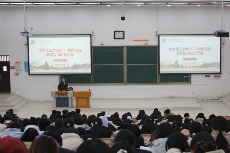 为扎实推进2023级本科生教育实习工作,帮助学生明确实习任务,强化责任意识,以良好的状态投入到实习实践中,1月23日中午,化学化工学院于文昌楼102教室开展2023级本科生教育实习动员大会,学院党委副书记朱进、教学副院长赵茜怡、校内指导老师、带队老师、教务员及辅导员,2023级全体实习生近400人参与了本次会议。
