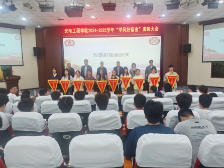 于坤宣读《关于表彰2024-2025学年学院“学风好宿舍”的决定》,对全院学习风气浓厚、学习成效突出的30个宿舍集体予以表彰。获奖宿舍学生代表付朵朵分享了宿舍学风建设的经验做法,从集体学习规划、互助答疑机制、学科竞赛协作等方面进行交流,展现了光电学子勤学笃行、同心致远的良好风貌,为全体同学树立了可学可做的榜样。高飞对获评“学风好宿舍”的集体表示热烈祝贺,向为学风建设辛勤付出的师生致以诚挚感谢。他表示,宿舍是大学生学习生活的重要阵地,更是培育优良学风、锤炼团队精神的第二课堂,光电学子应立足专业特色,以团结为帆、以奋斗为桨,将个人理想融入国家光电事业发展大局。