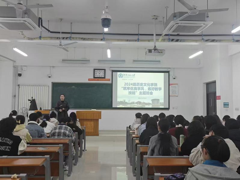 为进一步夯实学风建设,助力学生提升教学实践能力,备战第三届“行知杯”教学能力大赛,2026年3月24日,历史文化学院在文昌楼108教室召开“筑牢优良学风,练好教学技能”主题活动。活动由2024级辅导员张文华主持,学院教学技能专业老师及本科生参会。