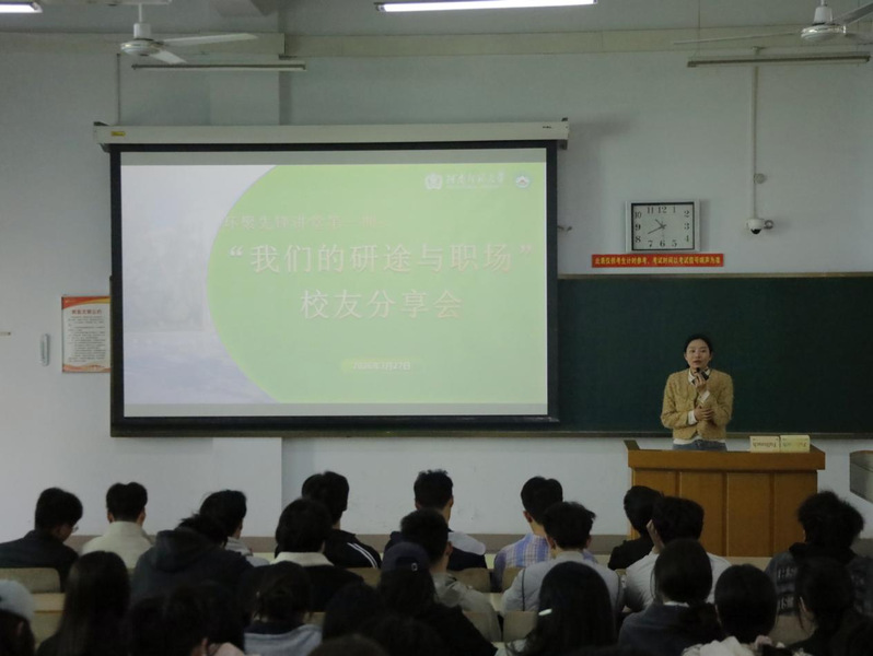 为精准服务学生发展需求,帮助同学们清晰把握当前就业与升学形势、找准自身发展定位,3月27日上午,环境学院于新五五四402教室开展第一期“环聚先锋讲堂”校友分享会。会议聚焦“我们的研途与职场”,特邀学院2016级校友胡新宇、2020级校友朱姿臣担任主讲,院团委副书记任洁主持会议,190余名同学到场聆听、交流学习。