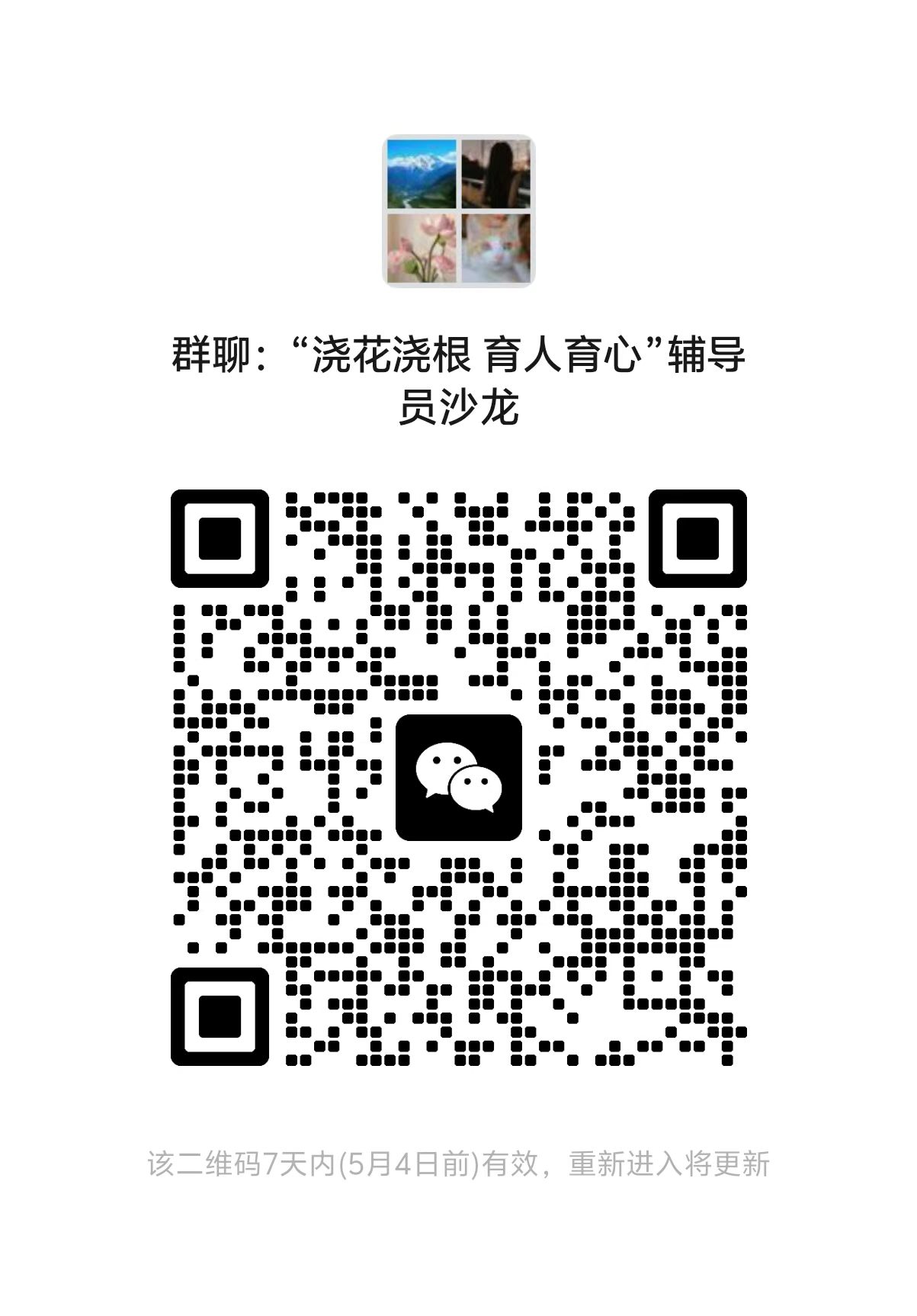 (四)严守纪律,规范参会秩序。每个学院须安排1名毕业班辅导员和二级心理健康教育工作站负责老师参加本次辅导员沙龙,参会人员请于4月28日上午12点前扫描附件2二维码加入工作群。原则上不得请假,确需请假的,学院(部)须安排其他专职辅导员参会。