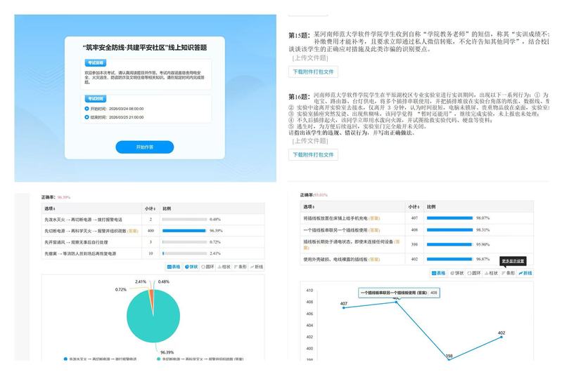 活动秉持“以考促学、以学促防”理念,精准聚焦宿舍用电、消防应急、反诈防骗等核心安全领域。社区成员发挥专业优势,通过系统化梳理安全要点、数据库分类存储,自主搭建安全知识题库,在实践中让“自我管理、自我服务、自我教育、自我监督”的理念落地生根。参与者需在规定时间内完成线上安全知识问答,本次答题分为客观题与主观题两部分:客观题主要考查日常安全常识与风险辨别能力,帮助同学们快速排查隐患;主观题则结合校园真实案例,引导大家梳理应急处置方法与反诈防范技巧,在思考中巩固安全知识。答卷完成后,由社区自管会统一对答卷进行评阅与成绩统计,最终评选出一、二、三等奖,为同学们颁发荣誉证书与奖品。同时,自管会依托平台数据开展分析,精准定位同学们安全素养短板,动态生成针对性提升建议,形成“学—答—悟—改”的完整育人闭环。