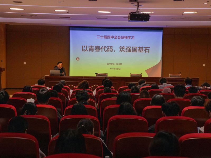 深入学习贯彻党的二十届四中全会精神,精准把握“十五五”规划战略部署,引导青年学子坚定理想信念、勇担时代使命,4月9日中午,软件学院党委书记寇玉鹏以“以青春代码,筑强国基石”为主题,在平原湖校区二号报告厅讲授专题党课。学生党员代表、2026年上半年入党积极培训班全体学员参加活动。