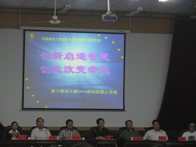 10月10日晚,河南师范大学多功能报告厅里座无虚席。经济与管理学院在此举办了主题为“创新启迪智慧 创业改变命运”的第十期名人堂成功经理人讲座。该讲座邀请到了新乡市永健面业有限公司总经理申万福、新乡市仙源保健饮料公司总顾问郑华童、新乡市华兰生物医药公司技术总监副总经理陈磊山等知名企业家,为同学们讲述他们的成功之路。此外,经济与管理学院党委书记朱建、工商管理系主任兼辉县汽车配件有限责任公司副总陈酉宜、市场营销系老师兼“IMP——这一带”总策划人董雪冰、2010级辅导员周芳等领导老师也出席了此次讲座。