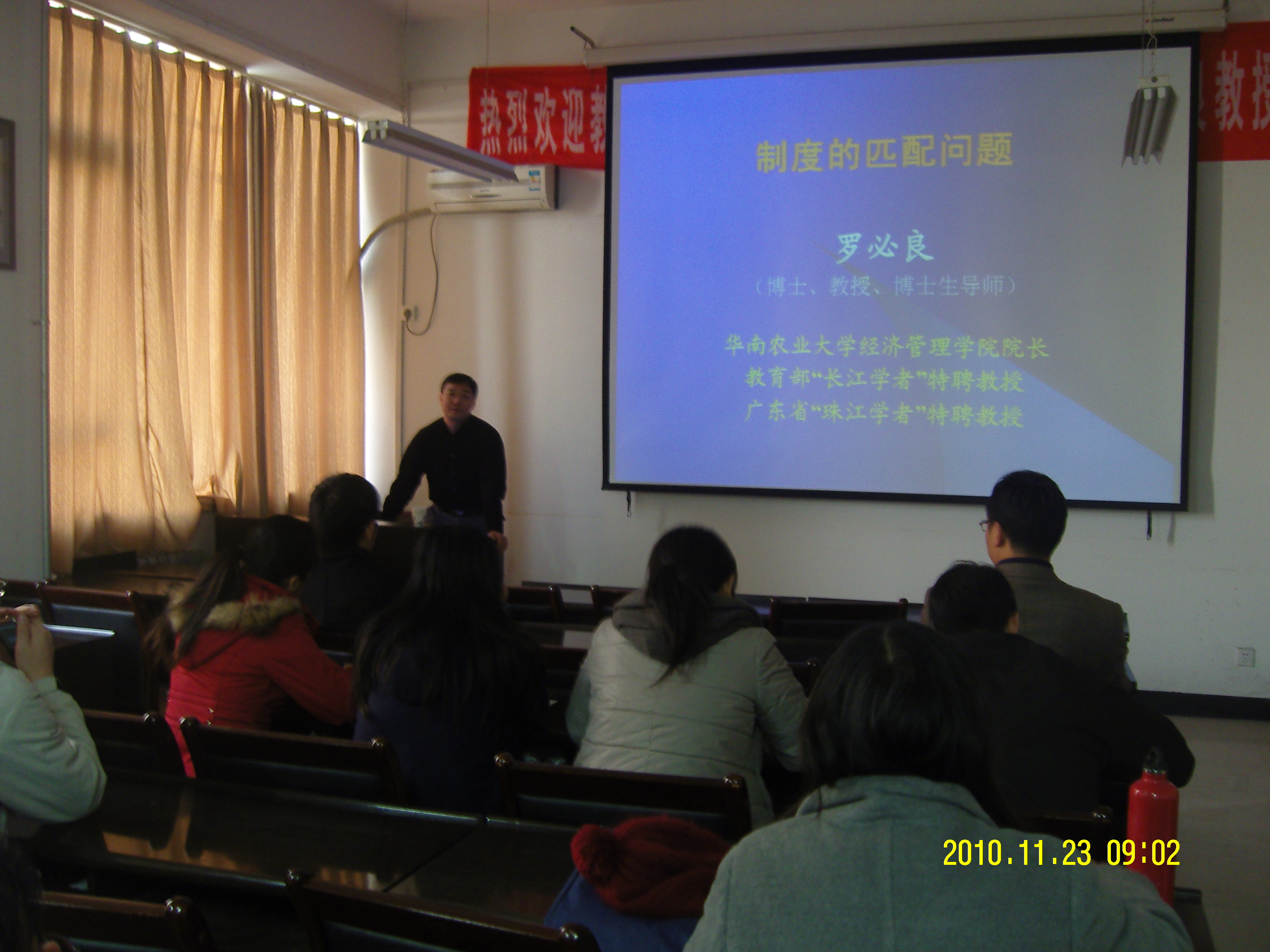 2010年11月23日,经济与管理学院报告厅座无虚席,教育部“长江学者”特聘教授、广东省“珠江学者”特聘教授、全国“新世纪百千万人才工程”国家级专家、华南农业大学经济管理学院院长、博士生导师罗必良教授到我校做了“制度的匹配问题”的学术报告,经济与管理学院副院长胡国恒、刘新同,教务处副处长任太增,学院全体教师、研究生本科生代表60余人参加了报告会,报告会由科研院长胡国恒主持。