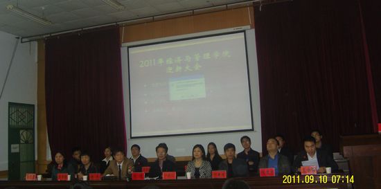 金秋九月丹桂香,新学年迎新气象。9月12日上午十点整,经济与管理学院2011级迎新大会在多功能报告厅隆重举行。出席此次大会的领导老师有院党委书记朱建、党委副书记李杰、教学院长刘新同、行政院长纪晓红、院各系主任及科级干部。会议由团委书记王令耀主持。全体2011级新生参加了此次大会。