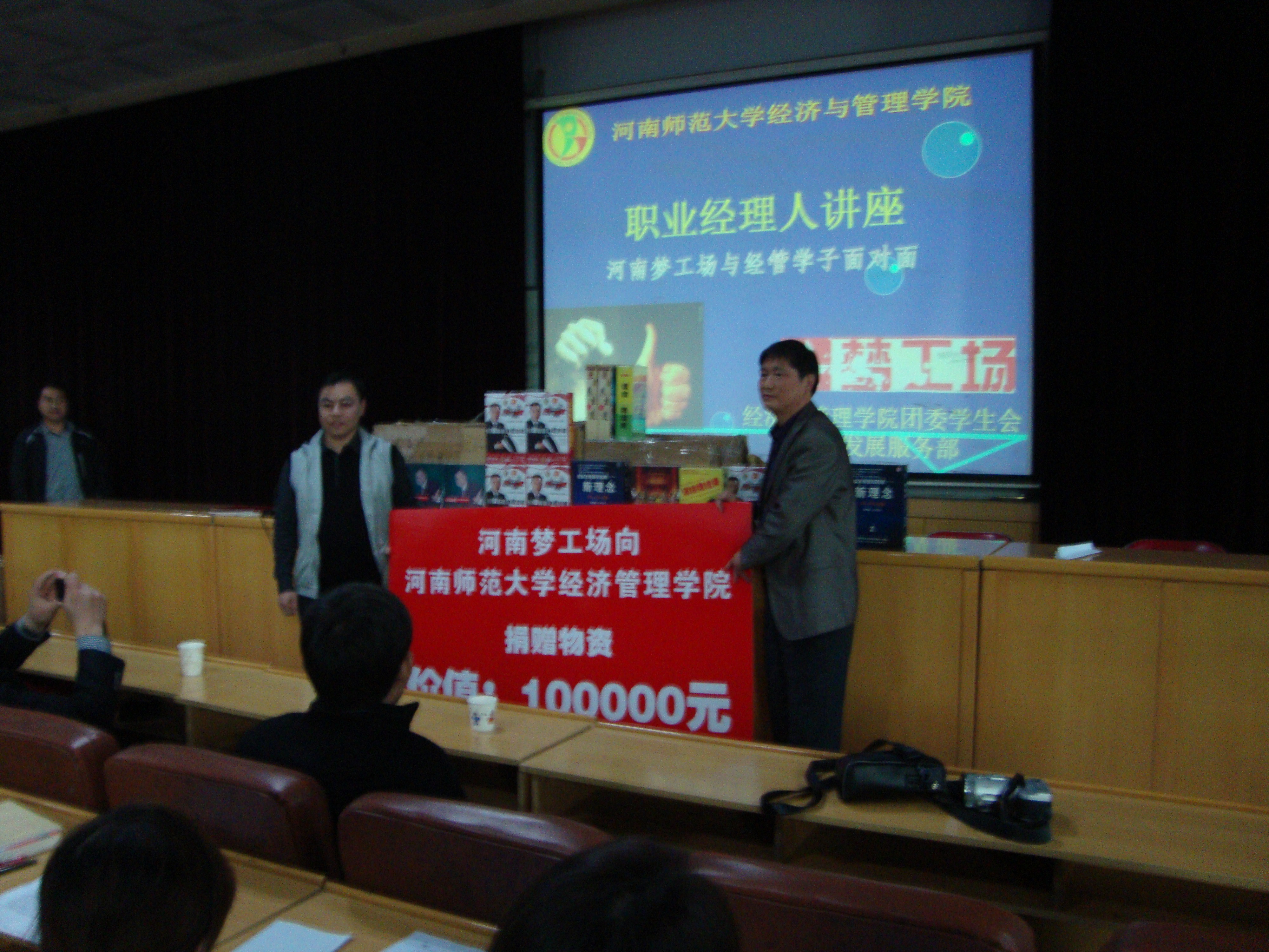 河南梦工场企业管理咨询公司向经济与管理学院捐赠价值10万元的书籍光盘的捐赠仪式拉开了讲座的序幕。首先,河南梦工场的董事长张秀滨先生从宏观上讲述了培训行业的发展趋势,指出企业度过生存期后都要注重团队建设和学习型组织的构建,因此管理咨询培训行业前景将十分广阔,最后他憧憬了河南梦工场的战略目标,即循序渐进的开分公司和进行有效的资本运作,从而带领公司在创业板上市,做更多慈善活动以回报社会。并希望经管学子加盟“梦工厂”。接下来,总经理刘军杰详细介绍了河南梦工场的发展历程、运营模式、所获荣誉、市场战略,使同学们对河南梦工场有了清晰明确的认识。最后,26岁的安阳分公司总经理刘贺结合自身经历,用饱含激情的语调主要从“为什么找工作”“如何成为工作的主人”“什么样的工作是好工作”“具备什么样的条件能胜任工作”等几个方面现身说法,鼓励同学们心怀梦想,脚踏实地,在工作岗位上一点一滴不断积累资源,定位清晰后聚焦坚持。他用情真挚、有说服力,不断迎来阵阵掌声。