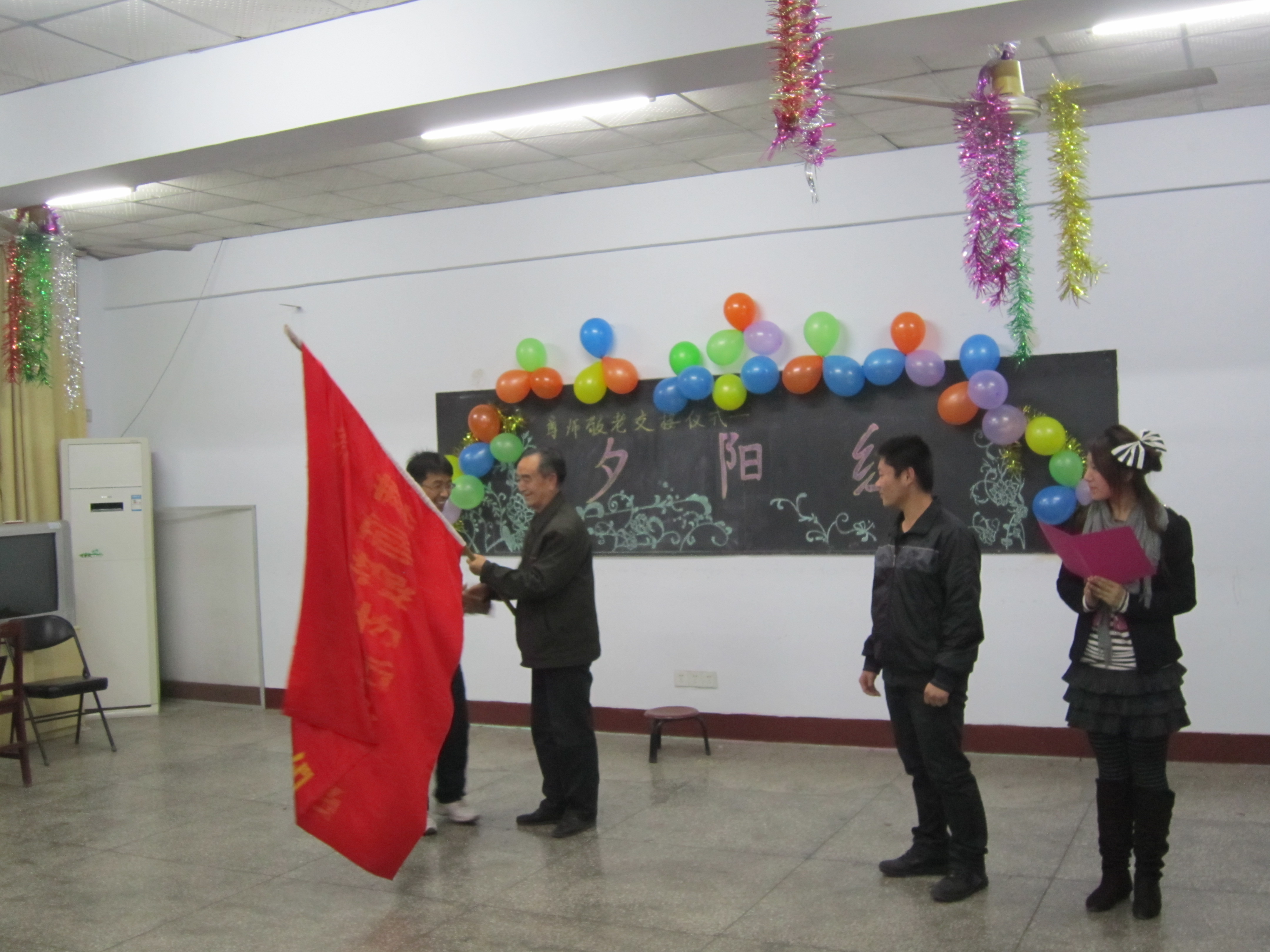 然后,2010级经济学一班班长赵冠星接过经济与管理学院尊师敬老活动小组旗帜,完成了尊师敬老活动的正式交接。交接结束后,2009级学生代表高晴和2010级学生代表郭丽分别进行了发言。高晴同学总结了一年以来取得的成绩、收获的感悟,并鼓励下一届同学勇于创新,给老教师送去更多温暖、带去更多欢笑。郭丽同学表示以认真负责的态度对待尊师敬老,并积极策划、组织各式各样的活动,将尊师敬老的范围扩大。