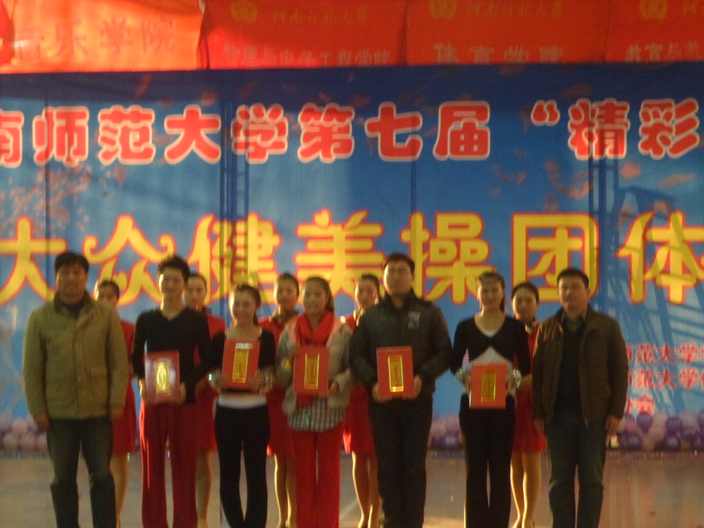随后,进行的12个学院代表队的角逐,第一个出场的是政治与公共管理学院,她们个个精神饱满,神采飞扬,动作灵活,给人以美的享受。我院选送的节目《Hey!Gril!向前冲》,一个个的姑娘打扮成了一个个可爱的小精灵,她们强健有力的舞台动作,优美和谐的形体姿态,律动鲜明的节奏美感,展现了力与美的结合,诠释了青春的激昂与奔放。最终,我院以总分第二名的成绩摘得了本次健美操团体赛学院组的一等奖。