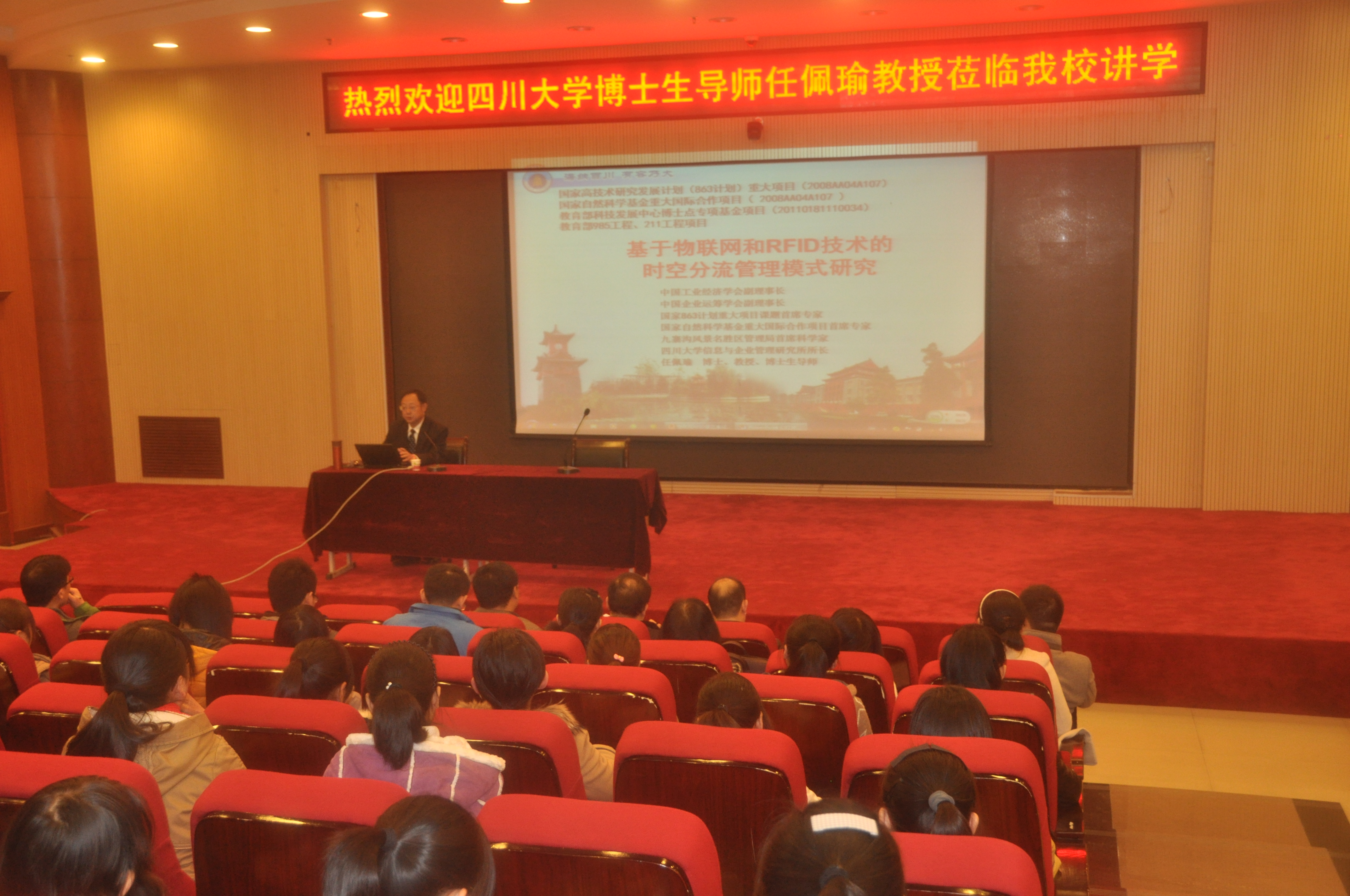11月22日下午,我校东区C楼思想政治理论课实践教学平台座无虚席。四川大学工商管理学院教授、信息及企业管理研究所所长、工商管理博士后流动站站长、工业工程学科和企业管理学科博士生导师任佩瑜教授在这里做了一场题为“基于物联网和RFID技术的时空分流管理模式研究”的学术报告。报告会由商学院科研院长乔俊峰博士主持。商学院骨干教师、研究生、本科生等300余人听取了此次报告。