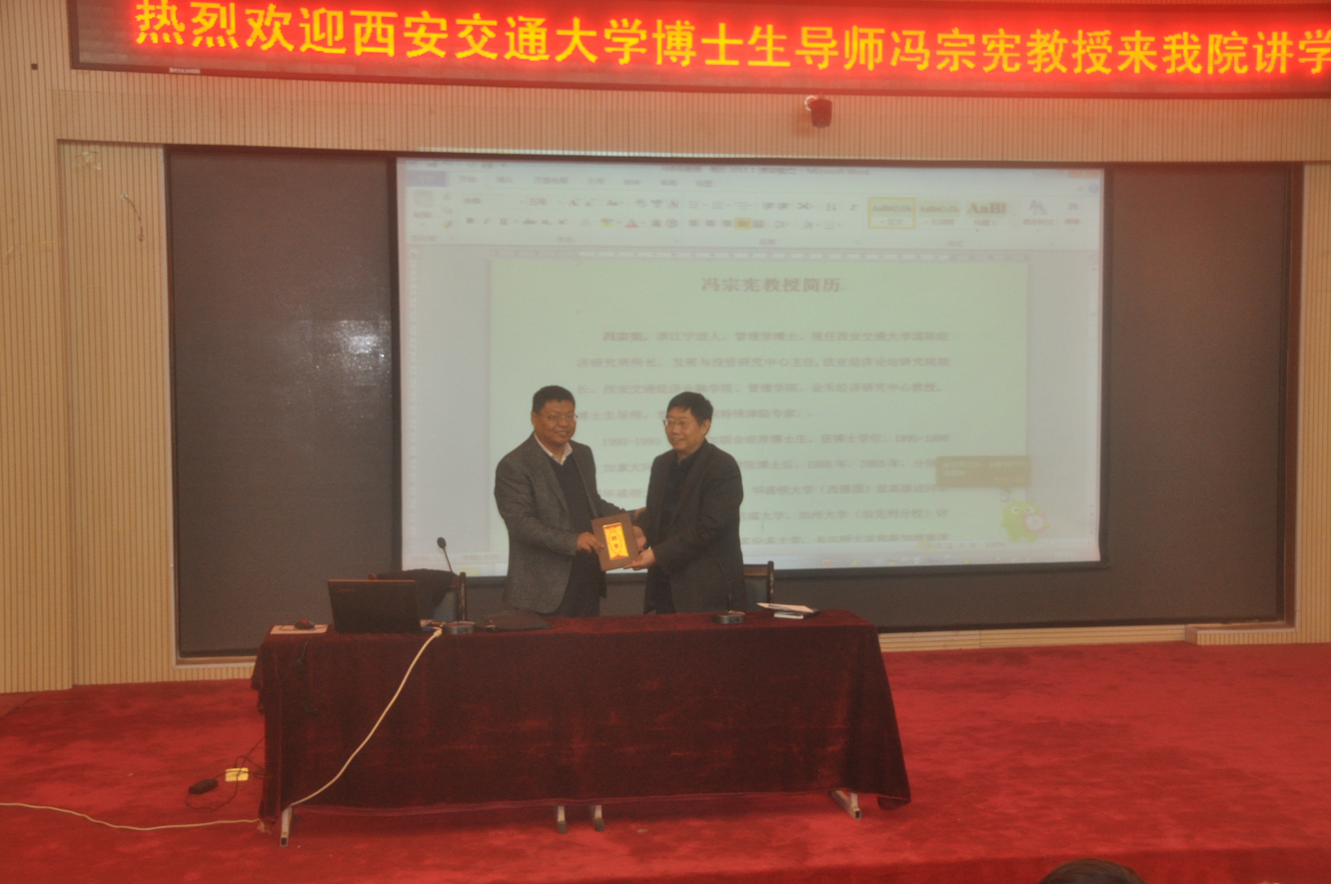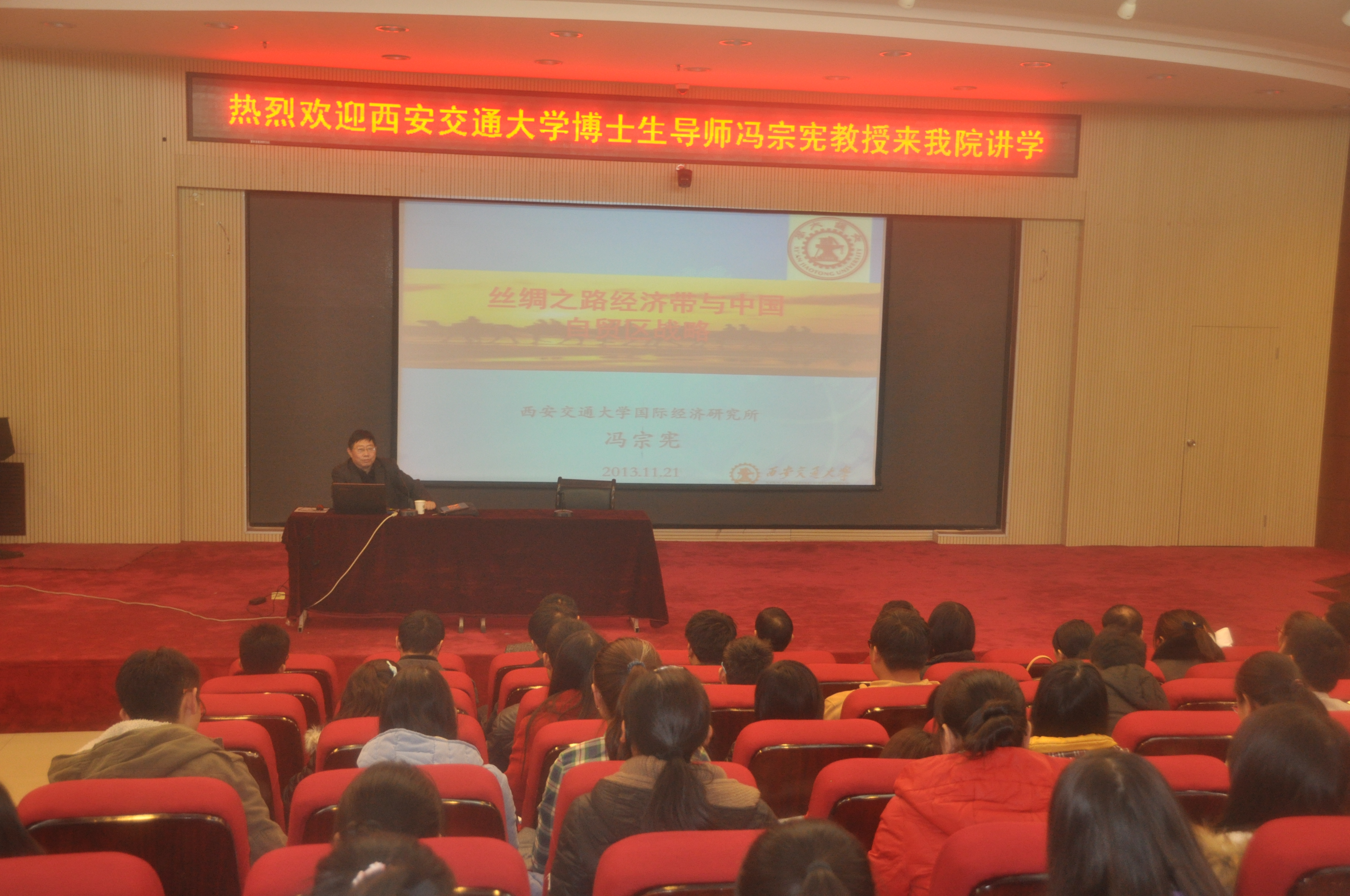 12月5日上午,西安交通大学经济与金融学院博士生导师冯宗宪教授应邀来我校进行学术交流,并受聘为我校兼职教授。冯宗宪教授在校园东区C楼思想政治理论课实践教学平台作了一场题为“丝绸之路经济带与中国自贸区战略”的学术报告,商学院党政领导及骨干教师、研究生、本科生等300余人听取了此次报告。报告会由商学院院长任太增主持。