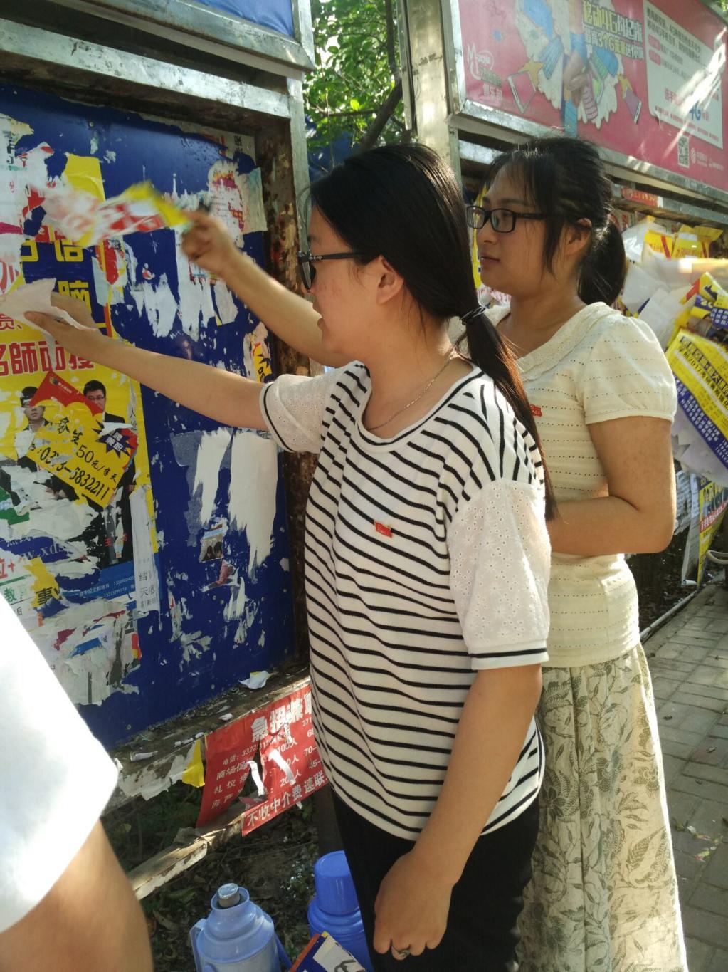 商学院全体学生党员积极响应“两学一做”学习教育,把学习党章与做合格党员实践活动结合起来。广大学生党员以实际行动在校园内公告栏等地清除小广告,净化校园环境,改善了文化氛围,将“两学一做”落实到具体实践中。