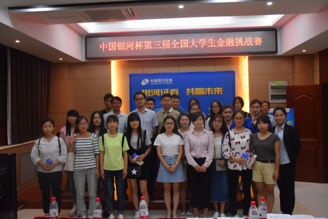 生财有道,智赢天下。9月23日晚七点,由中国银河证券与浙江核新同花顺网络信息股份有限公司联合主办、商学院团委学生会科研部承办的第三届中国银河杯大学生金融挑战赛宣讲会于商学院办公楼119报告厅隆重召开。中国银河证券新乡友谊路营业部总经理王清锋、经理高俊霞,同花顺河南区域负责人汪海芳以及中国银河证券客户经理肖凡受邀出席本次活动,我院100多名学生积极参加了此次宣讲会。会议由院团委书记兼2015级辅导员王岩主持。