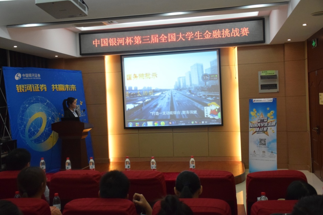 会议伊始,团委书记王岩代表学院对到场嘉宾表示热烈的欢迎,并鼓励同学们踊跃参与本次金融挑战赛,积极主动地去提升自己。接着,中国银河证券新乡营业部经理高俊霞分别从“改革之路”、“综合实力”、“项目经验”等六方面简要介绍了中国银河证券的发展情况,并就同学们较关注的招聘要求方面做具体解释。随后,同花顺公司河南区域负责人汪海芳为大家详细阐述本次大赛报名流程,并指导同学们现场操作,大家纷纷表示对该赛事有浓厚兴趣,会后将进行更深层次的了解与研究。最后,工作人员结合具体案例为大家详细讲解有关股票的基本知识,分析股票涨跌时期,为参赛同学提供了一定的理论保证。现场交流热烈,气氛高涨,宣讲会在热烈的掌声中落下帷幕。