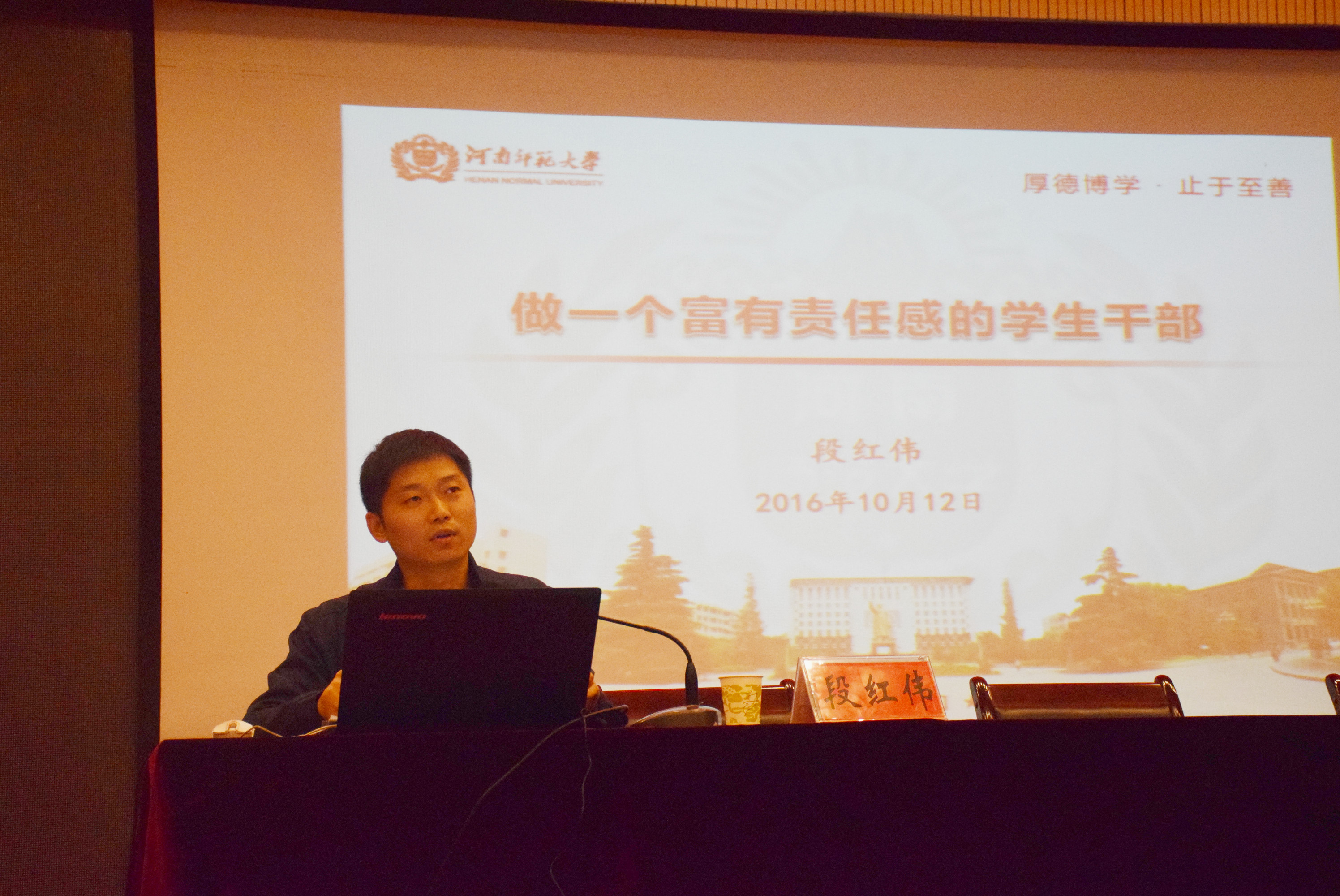 为进一步提升新生干事们的能力,加强对学生工作的了解,10月14日晚,商学院于东区C楼思想政治理论课实践教学平台举办“做一个富有责任感的学生干部”专题讲座。讲座特别邀请到商学院党委副书记段红伟作为主讲人,商学院全体学生干部聆听了此次讲座。