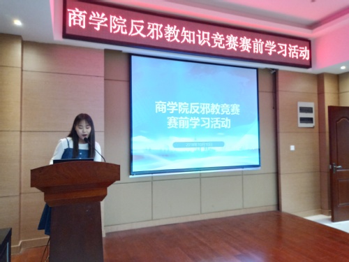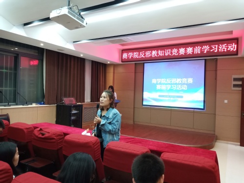 为推进反邪教知识竞赛的顺利进行,10月10日晚八时,商学院在学院楼119会议室举行反邪教竞赛赛前学习活动。2017级兼职辅导员张若楠应邀参加本次活动,商学院部分学生到场聆听。