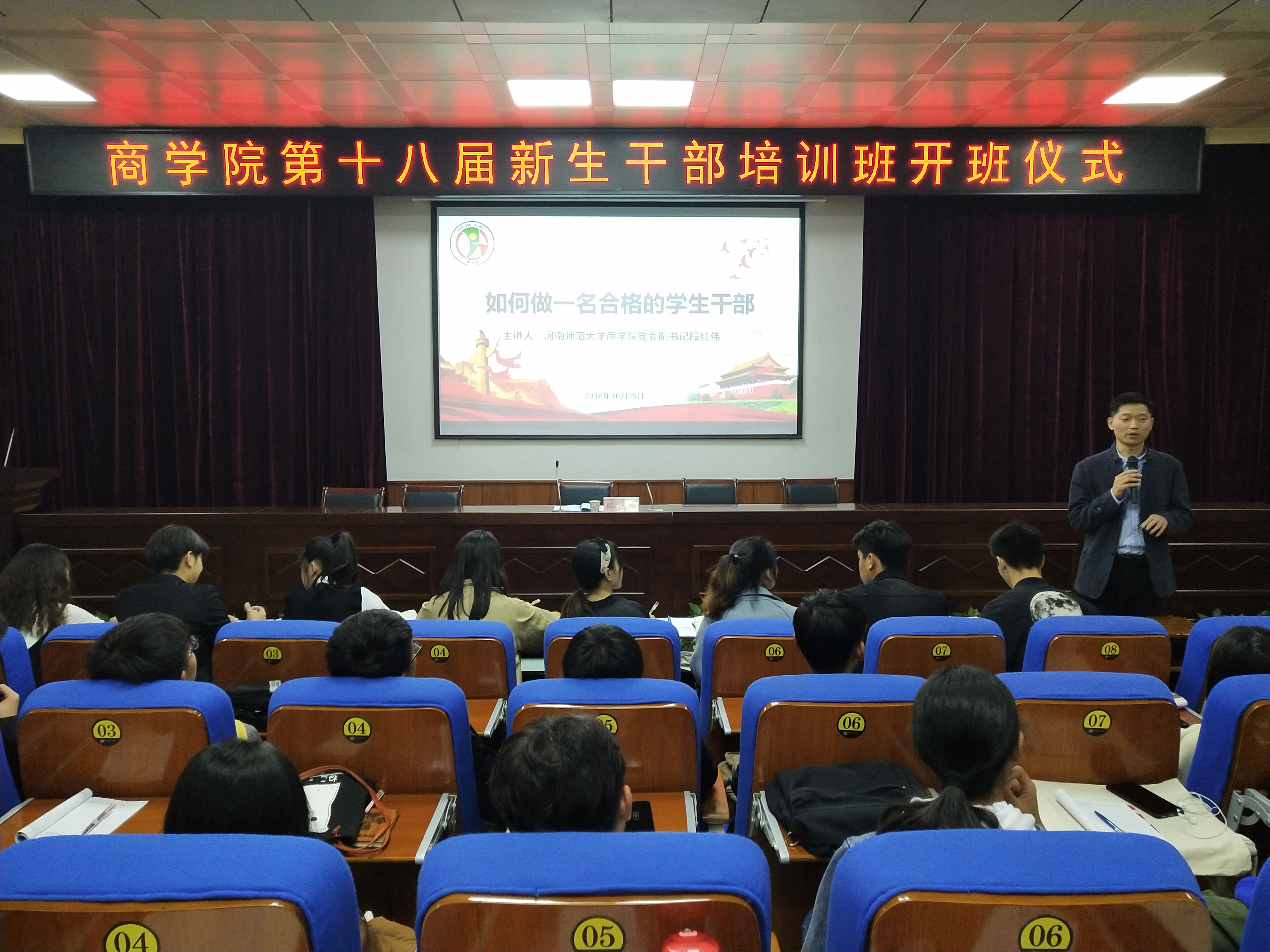 为深化学生干部队伍建设,提升全方位、全过程育人成效,10月25日晚七时,商学院第十八届新生干部培训班开班仪式暨开班第一课在党校教室顺利举行。商学院学生工作相关负责人受邀出席本次大会,学院2018级全体新生干部参会学习。
