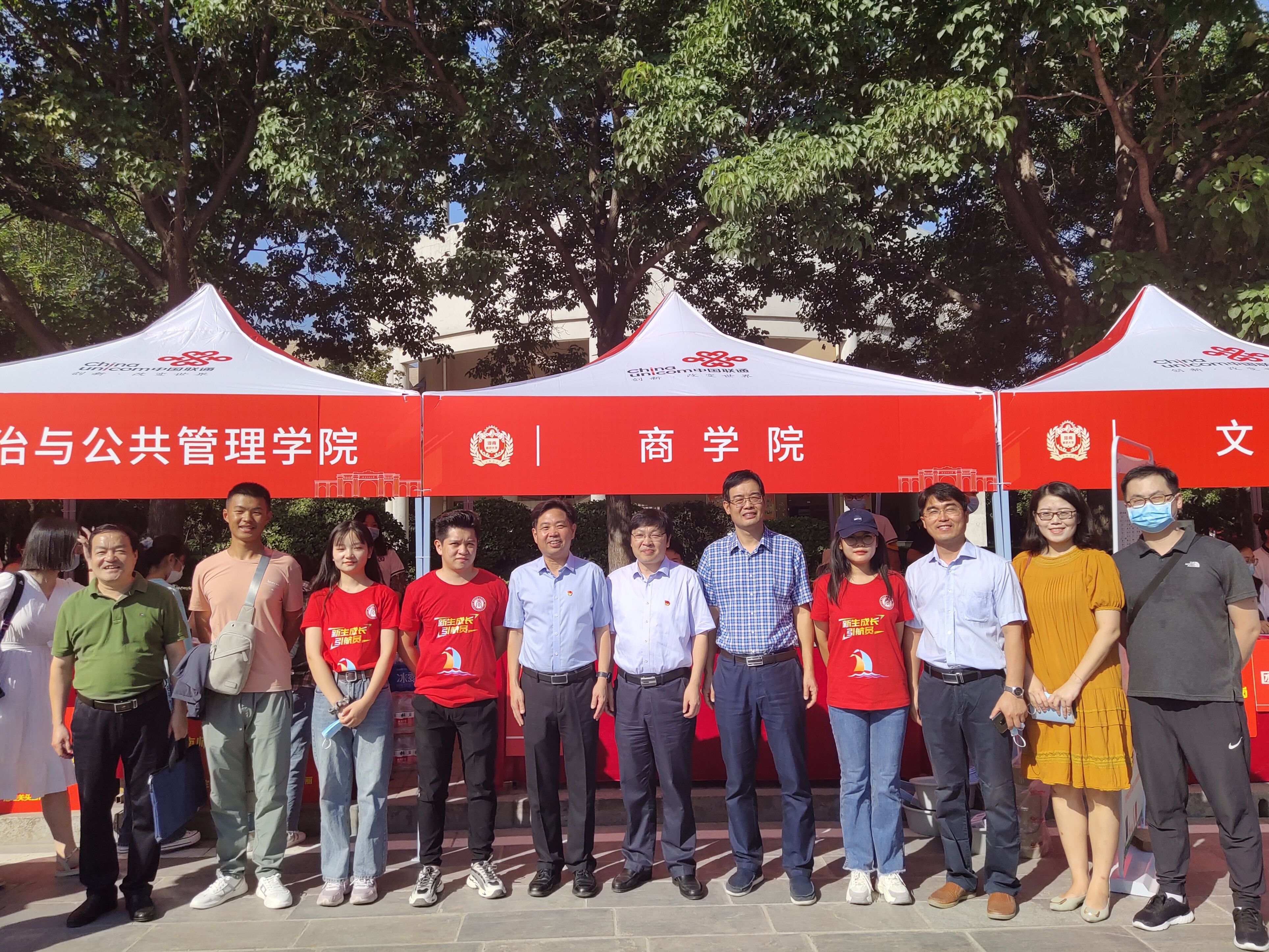 我院迎新工作的顺利开展离不开新生成长引航员的付出。新生成长引航员在开学前便与新生取得联系,明确每位新生的到校时间并上报学院,学院详细地做出迎新时段统计,并于不同时段安排至少80名志愿者等候新生到来,确保在高峰期能够做到精准对接。在新生到达学校时,相应引航员与他们位置共享,时刻关注其位置信息,由调度员安排相应人数的志愿者与其对接工作,第一时间带领志愿者前往迎接新生,努力落实“一分钟对接”原则。新生报到的过程中,引航员们认真核对家长与学生的健康码,带领新生完成报到并进行住宿登记、行李搬运,随后耐心向新生介绍防诈骗、用电安全等注意事项。面对贫困学子,商学院为其准备了暖壶、香皂、衣架等生活用品组成的“爱心大礼包”,使得同学们感受到商学院的温暖氛围。上午10时,校领导莅临我院迎新摊位视察工作,详细询问了我院迎新工作的开展情况。校领导在了解到我院“致学弟学妹的一封信”、“‘商’书心意,翰墨人生”、“一分钟对接”等特色活动后,对我院的迎新工作提出了表扬,并与我院新生成长引航员拍照留念。