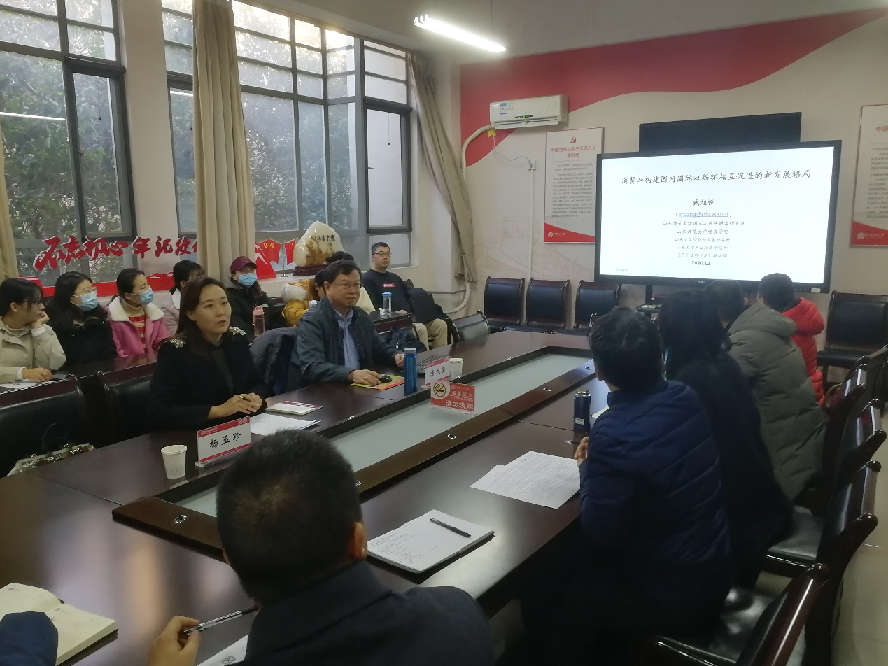 12月14日上午,应商学院邀请,山东大学经济学院臧旭恒教授在商学院二楼会议室为我院师生做了一场题为《消费与构建国内国际双循环相互促进的新发展格局》的学术报告。商学院院长杨玉珍,副院长李荣华、王喜刚、海本禄,学院部分骨干教师和全体研究生到场聆听学习。报告由商学院杨玉珍院长主持。