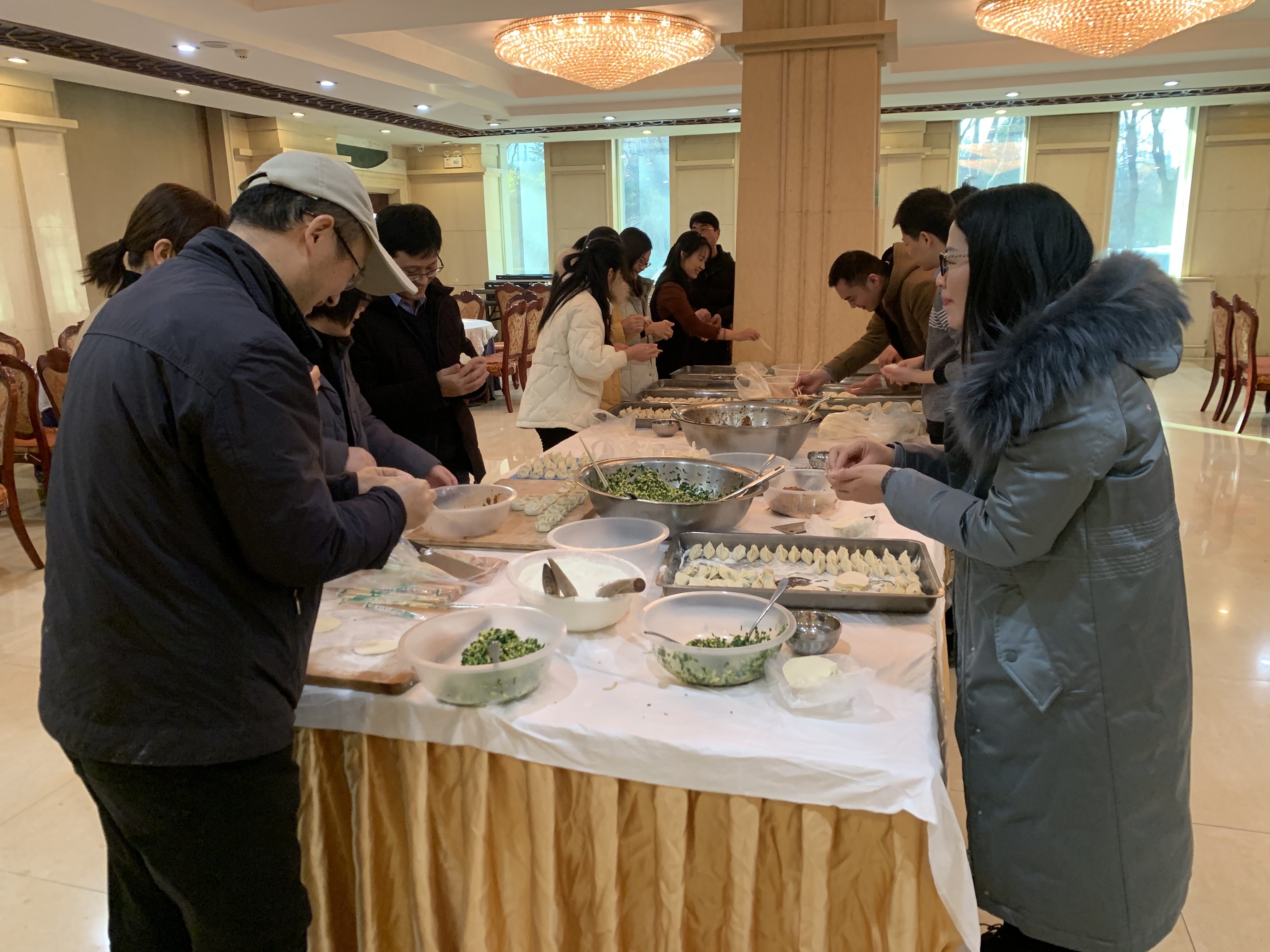 下午三点半学院领导和教职工陆续抵达现场,老师们分工合作,配合默契,揉面、擀皮、包馅,一道道工序有条不紊。大家一边忙碌一边围绕着学习、生活、工作等方面展开交谈,在包饺子的过程中,面粉飞扬,欢声笑语,其乐融融。