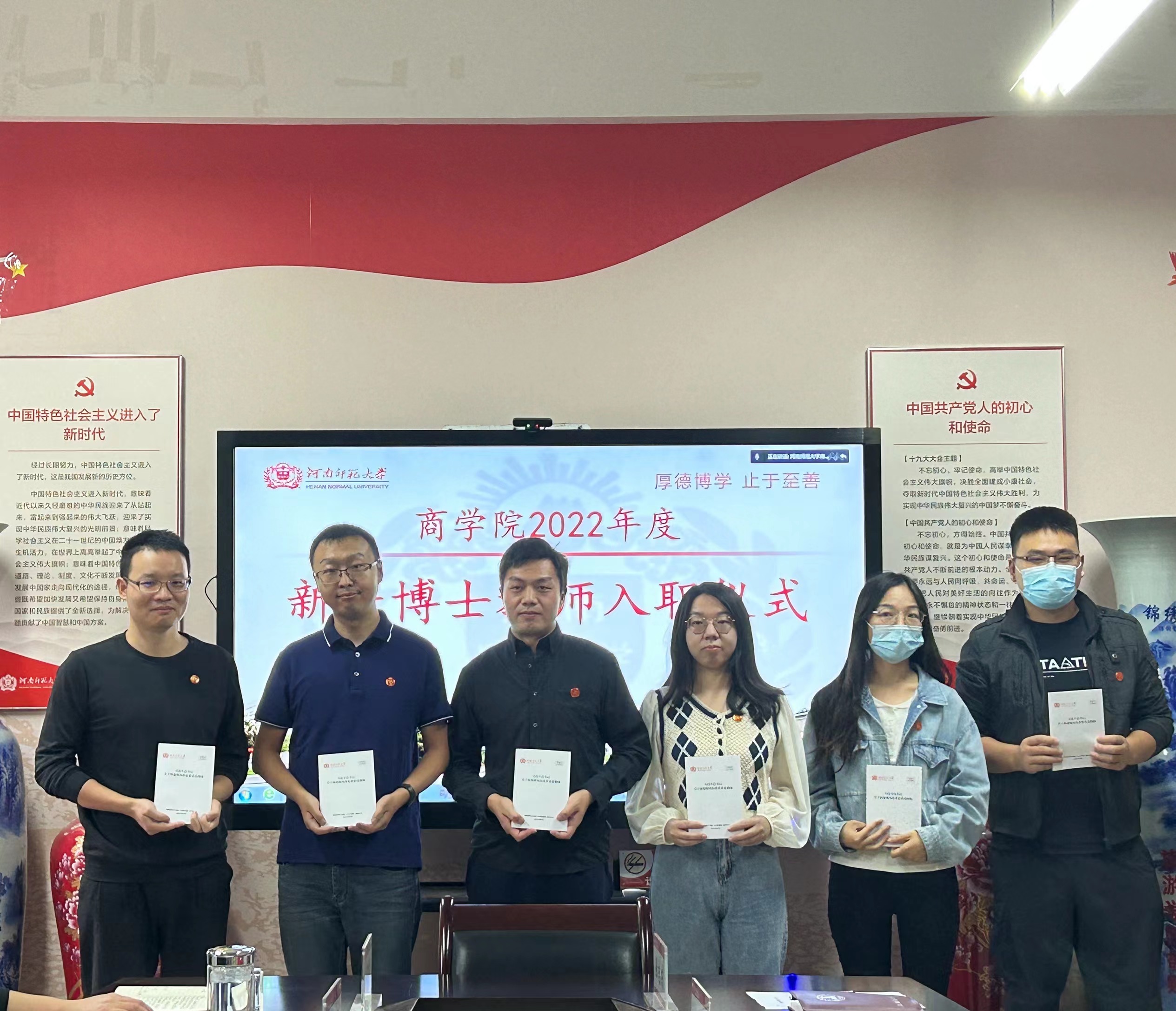 会议为2022年新进教师举行了入职仪式。仪式上,副院长李荣华带领新进教师进行了集体入职宣誓,宋晔为新进教师佩戴了河南师范大学校徽,李志前为新进教师发放了《习近平总书记关于师德师风重要论述》学习资料。