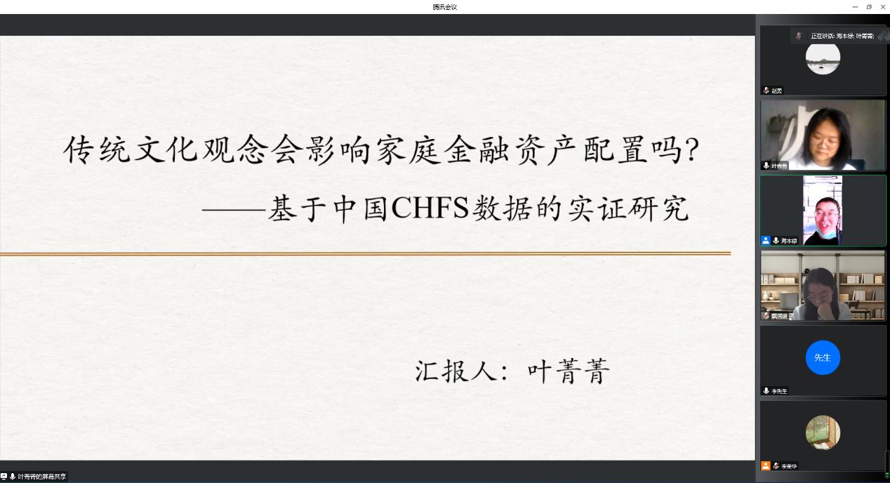 叶菁菁博士对论文选题、研究背景、研究思路与创新进行介绍,详细地讲述了论文的研究框架和结构,深入分析传统文化观念对家庭风险资产选择的影响,并从风险偏好、金融信息关注、预防性储蓄和住房投资四个维度阐释传统文化观念如何影响家庭风险资产配置,进一步识别了传统文化观念与家庭风险资产配置之间的因果关系。在论文交流环节,海本禄教授提出了详细的修改意见,建议通过南北方的文化差异进行稳健性检验,进一步提升论文的整体质量与水平。与会教师积极发表对汇报论文的修改建议和看法,讨论气氛热烈。