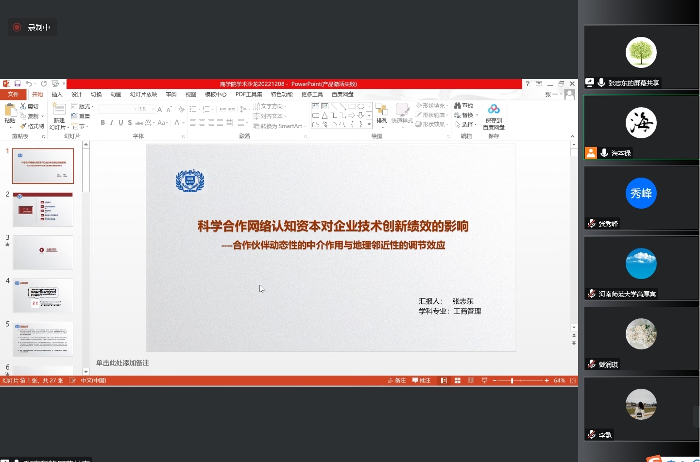 为了进一步增强学术氛围,推动骨干教师之间的学术交流,12月9日下午,商学院举办第六期学术沙龙活动。青年教师张志东博士对个人研究成果《科学合作网络认知资本对企业技术创新绩效的影响--合作伙伴动态性的中介作用和地理邻近性的调节作用》进行分享与交流。本次学术沙龙使用腾讯会议的方式在线上进行。本次活动由副院长海本禄教授主持,学院骨干教师20余人参加。