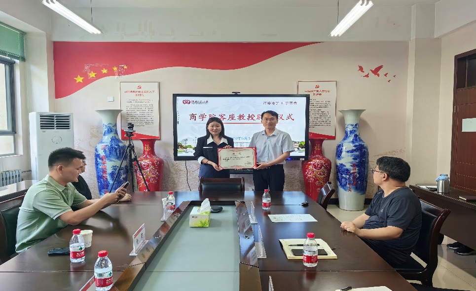 会上,商学院党委书记李志前对商城县各位领导的莅临考察指导表示热烈欢迎,介绍了商学院的基本情况,他表示,开展校地合作是双方发挥各自优势、协同育才、共同推进乡村振兴的一次良好机会,希望本次合作能充分发挥学院的人才优势、科研优势及商城县的实践资源优势,助力当地经济发展。赵阳辉表示,将加强与学院的对接联络,在合作的基础上进一步探索校地合作优势,在乡村振兴实践中凝聚共识、增添亮点、展示作为,孵化出特色产业,共同努力将校地合作工作推深走实,实现优势互补、人才共育、合作共赢。最后,会议进行聘请仪式,聘请杨娟为河南师范大学商学院客座教授。