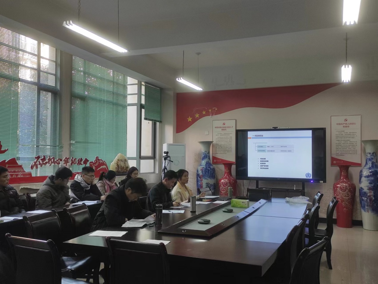薛豫南博士对论文选题、研究背景、研究思路进行介绍,详细地讲述论文的研究框架和结构,论文构建了时间阶段-政策目标-政策工具三维分析框架,详细分析了1994-2023年间国家层面297份政策文本。与会老师积极发表了对汇报论文的修改建议和看法,讨论气氛热烈。