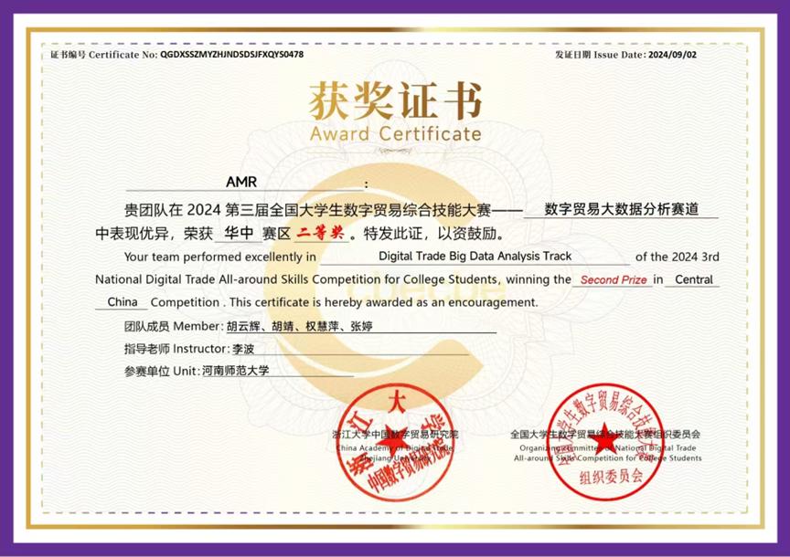 近日,第三届全国大学生数字贸易综合技能大赛华东赛区区域赛的评审结果揭晓,商学院AMR团队于大数据分析赛道荣获二等奖,特向学院全体师生报喜。
