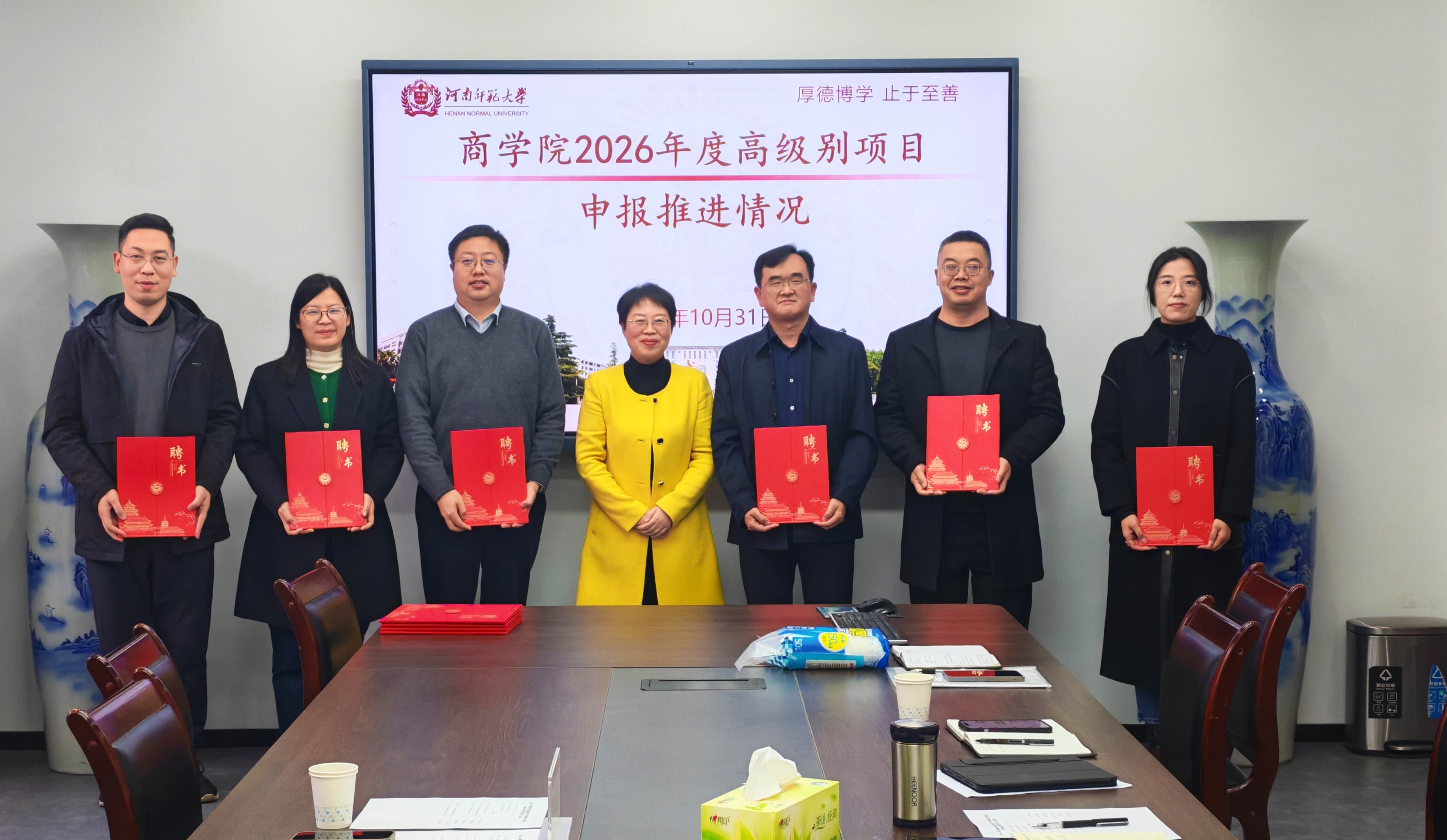 第二个环节为“2025—2026年度商学院科研导师聘任仪式”,赵黎波为科研导师代表颁发聘书,勉励他们发挥引领作用,助力学院科研水平提升。刘英基对社会科学处长期以来的支持表示感谢,并对新一届科研导师提出期望。他指出,科研导师是学院科研梯队建设的关键力量,希望大家继续聚焦“学术引领、团队赋能、成果转化”三大任务,做实“一对一”精准指导,促进资深教师与青年博士协同成长,推动学院国家级项目申报工作再上新台阶。本次推进会为商学院2026年国家级项目申报工作明确了目标、细化了方案、激发了动力、凝聚了共识。学院将以此次会议为契机,持续完善“导师—学员”结对机制,开展多轮文本打磨、模拟答辩等专项活动,强化激励保障,全面提升国家级项目申报质量与成效。