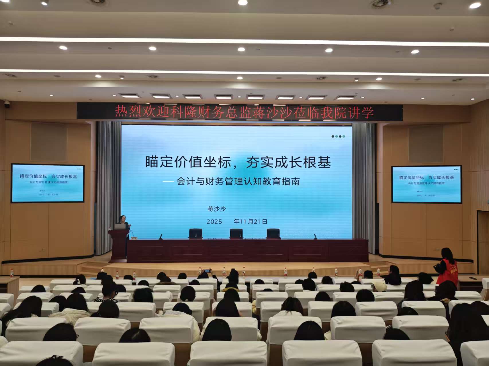 为深化学生对会计与财务管理专业的系统性认知,科学规划职业发展路径,11月21日,商学院于求真楼五楼东报告厅成功举办“锚定价值坐标,夯实成长根基——会计与财务管理认知教育指南”专题讲座。本次讲座特邀科隆公司财务总监蒋沙沙担任主讲人,商学院各年级学生积极参与。