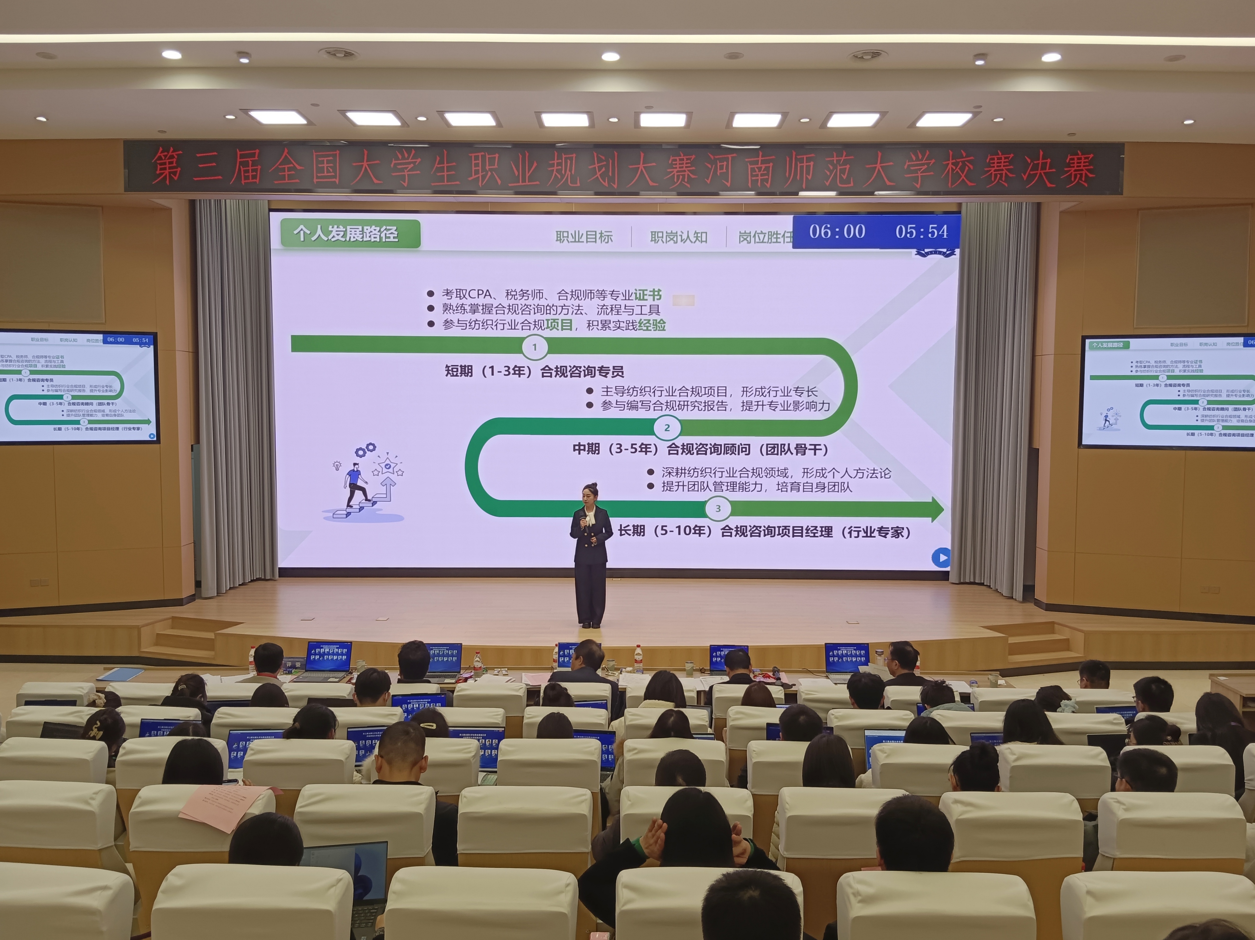 12月27日下午,由校招生就业处主办、商学院承办的第三届全国大学生职业规划大赛河南师范大学校赛决赛在东区实训楼五楼东报告厅举行。副校长宋晔出席活动并讲话。学校相关部门负责人、各院(部)党委(党总支)副书记、团委书记、就业专员、辅导员及师生代表300余人到场观摩。