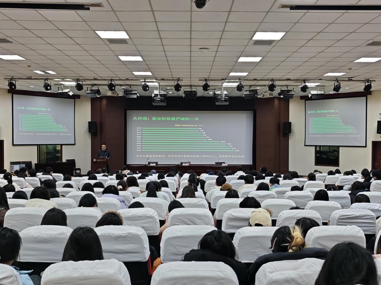 报告中,张江利围绕当前高校毕业生就业形势和学生关心关注的热点问题,从“就业形势分析、就业观念调整、就业去向选择、就业行动策略”四个方面作了系统讲解和深入指导。他结合宏观经济形势和高校毕业生规模变化,深入剖析了当前就业市场面临的机遇与挑战,帮助同学们认清就业现状、把握发展趋势,增强理性认识和心理预期。他引导同学们打破“盲目考研、考公考编、家乡情结、被动等待”等固有执念,树立科学理性的择业观和成才观,鼓励大家从长远发展出发,合理规划职业起点。同时,他系统梳理了毕业生多元化就业渠道,围绕企业就业、基层就业、升学深造、征兵入伍、出国深造等方向,引导同学们进一步拓宽视野、找准赛道,结合自身专业优势和能力特长作出更加理性的选择。最后,他从简历优化、信息获取、求职节奏把控和面试准备等关键环节入手,提出了具有针对性和可操作性的建议,指导同学们精准发力、高效求职。