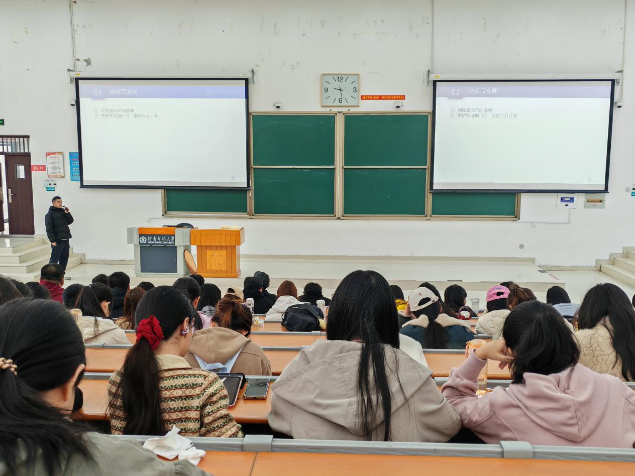 本次会议特邀商学院2023级经济学一班干明辉、2023级工商管理班刚艳茹两名优秀退役士兵分享军旅故事、解读征兵政策,为有志投身国防事业的学子搭建答疑解惑的平台,让青春报国的理想在校园中蔚然成风。