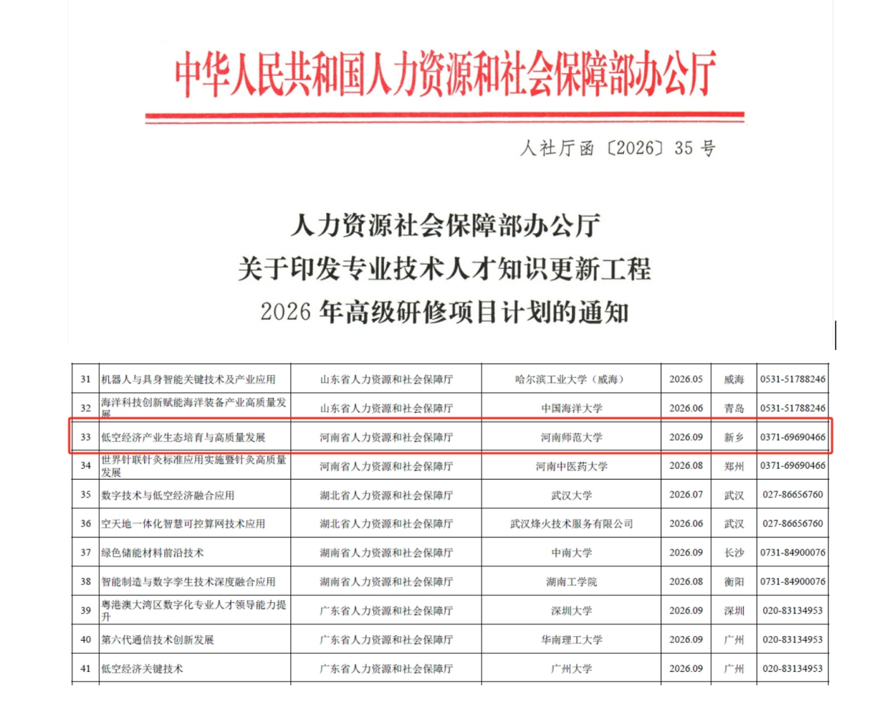 近日,国家人力资源和社会保障部发布了《关于印发专业技术人才知识更新工程2026年高级研修项目计划的通知》(人社厅函〔2026〕35号),我院申报的“低空经济产业生态培育与高质量发展”成功入选财政资助项目,全省共获批三项,我校仅此一项。