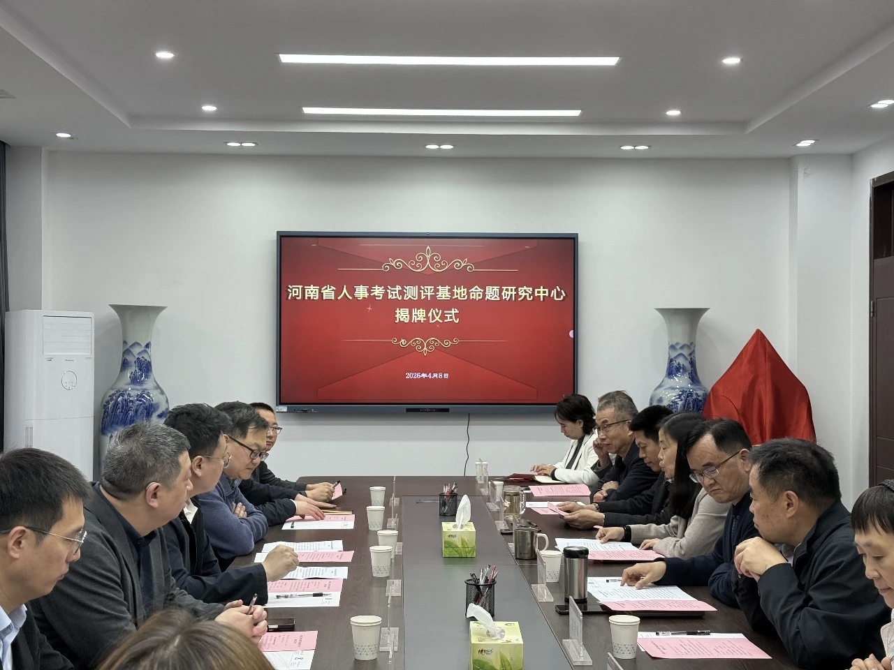 最后,胡霄汉与刘英基共同为“河南省人事考试测评基地命题研究中心”揭牌,并合影留念。