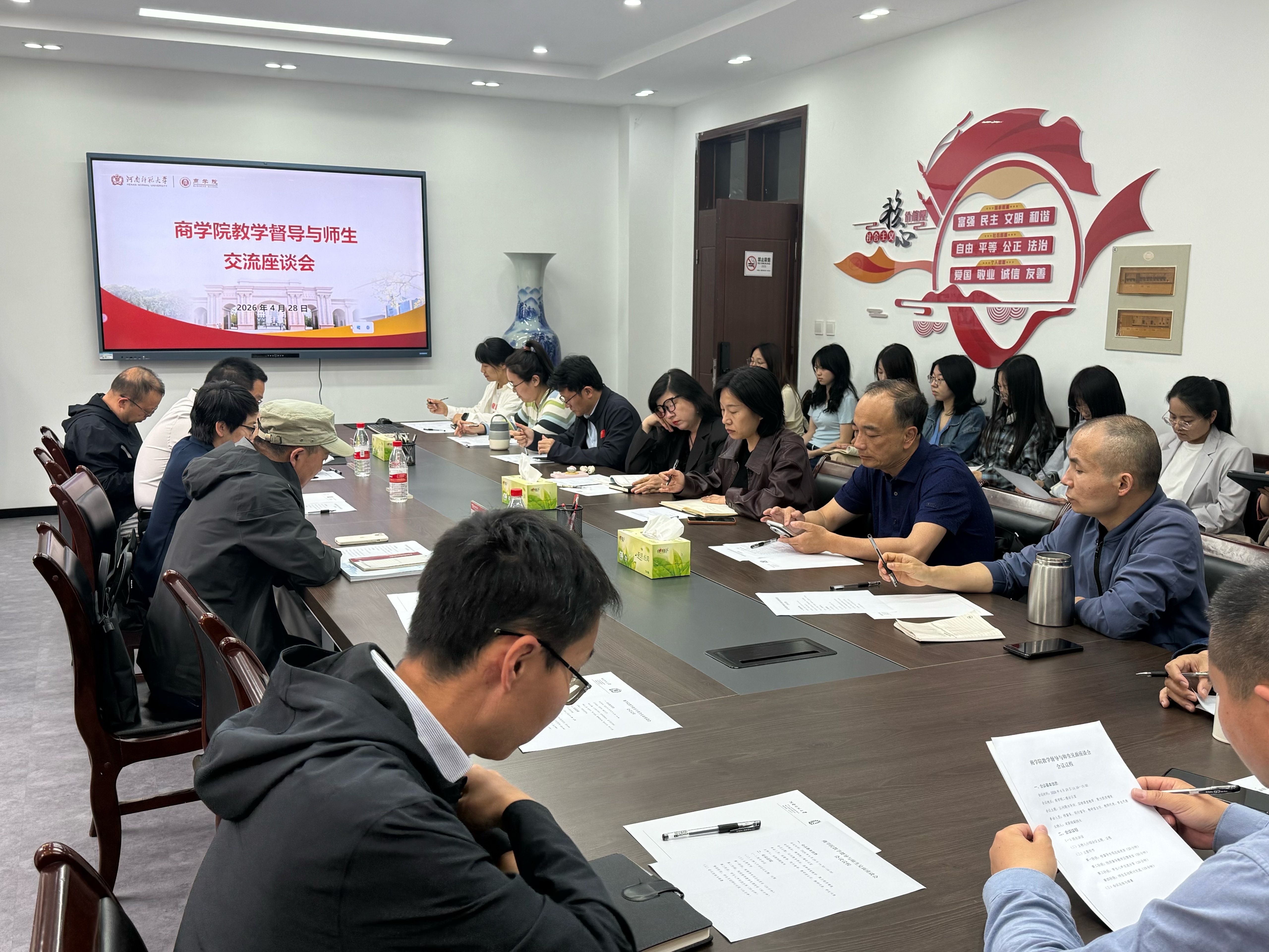 为切实提升教育教学质量,精准对接师生教学诉求,4月28日下午,商学院在二楼会议室召开教学督导与师生交流座谈会。学校督导、同行督导、学院教研室主任及师生代表近40人参加会议。座谈会由副院长宋跃刚主持。