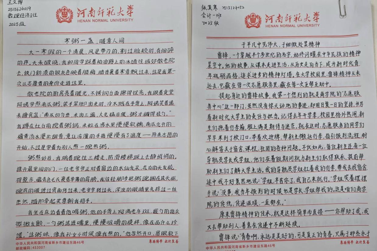 本次活动号召同学们聚焦身边的志愿故事与温暖瞬间,以手写文稿的形式记录校园里的奉献点滴。在征集活动中,同学们以朴实、真挚的文字为载体,用心捕捉日常学习生活中的暖心片段,书写身边的雷锋式善举,生动展现出学院学子奉献、友爱、互助、进步的精神风貌。经过严谨、公正的评审筛选,一批紧扣主题、内容鲜活、情感真挚的优秀征文脱颖而出。其中,张莫寒立足校园生活,以字字真情记录日常生活中同学间互帮互助的温暖小事,描绘校园志愿者默默付出的动人瞬间,诠释出新时代青年对雷锋精神的深入理解与深刻践行。王文博以一碗暖粥入题,生动刻画敬老院里志愿者的无私关怀,字里行间展现出雷锋精神在平凡生活中的薪火相传,以文字的力量激励同学们积极参与志愿文化活动,用实践弘扬雷锋精神。