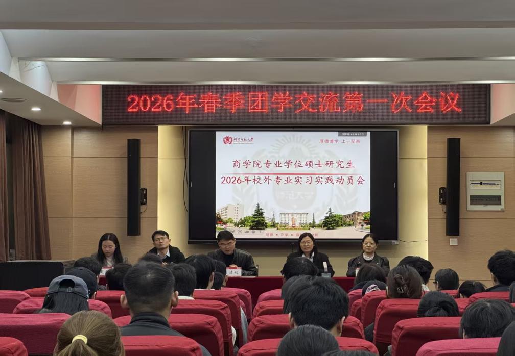 为切实做好2026年专业学位硕士研究生校外实习工作,强化实践育人成效,确保实习过程安全、规范、有序,3月23日上午11时,商学院在学院一楼会议室召开2026年校外专业实习实践动员会。学院党委副书记陈清利、副院长李荣华、教师代表李鹏飞和李敬出席会议,83位专业硕士研究生参加会议。