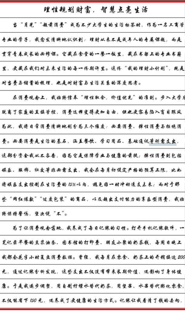 本次活动分为策划筹备、宣传预热、作品征集、总结推广四个阶段。活动期间,同学们围绕“理性规划财富,智慧点亮生活”这一核心主题,结合个人消费习惯、储蓄规划与生活实践,分享了各具特色的理财心得与成长感悟。征集作品视角多元、逻辑严谨,内容涵盖日常消费复盘与个人财富规划,充分展现了学院学子对财富管理的理性思考与独到见解。其中,2025级国际经济与贸易专业何玉的作品尤为亮眼,她以详实的日常记账数据为支撑,生动讲述了从盲目“月光消费”到主动“理性储蓄”的转变历程,阐述了科学理财对个人成长的重要意义,兼具感染力与参考价值。